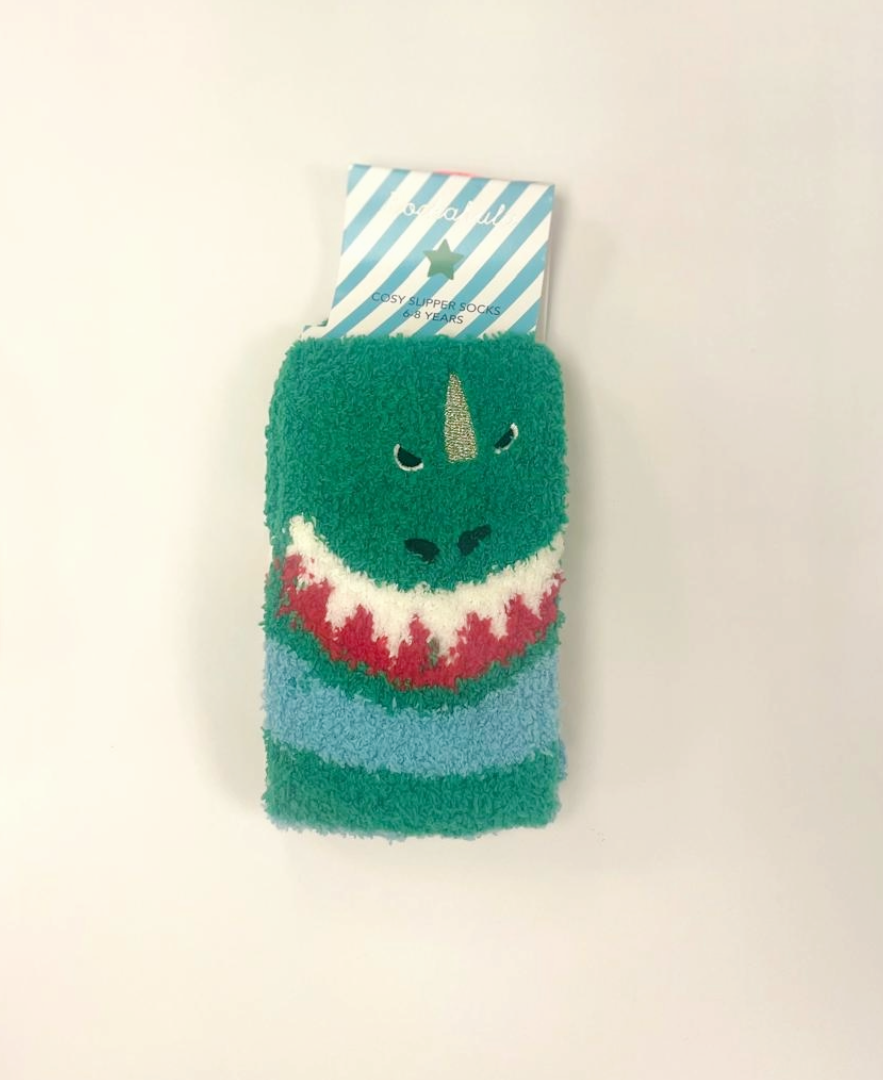 גרביים רכים ופרוותיים בדגם טי רקס מחייך, ורפידות נגד החלקה להליכה בטיחותית על רצפת פרקט.