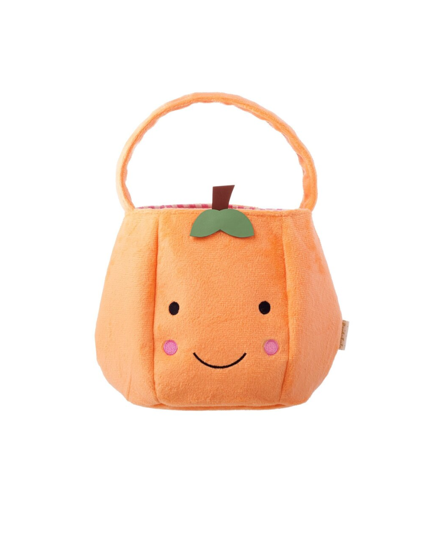 תיק דלעת מקסים עשוי קטיפה רכה בצבע כתום בוהק, עם פנים רקומים, לחיים ורודות, גבעול ועלה קטן. התיק מרופד מבפנים בבד מפוספס, והוא מושלם לכל פעילות חמודה או לאחסון חטיפים ופריטים קטנים.