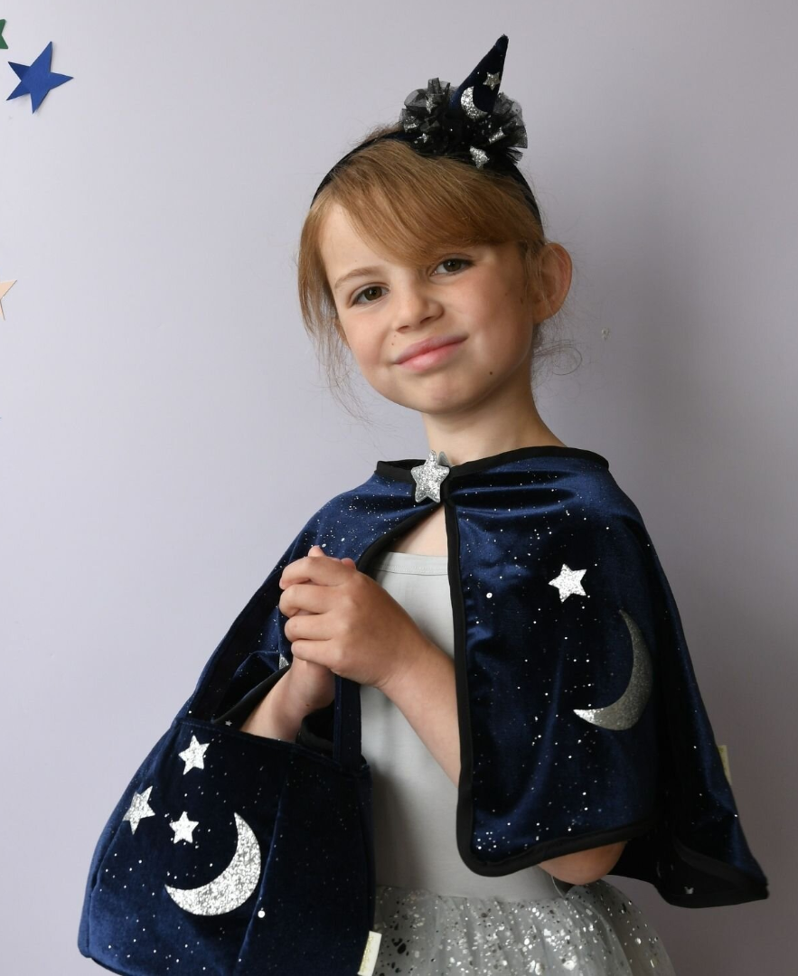תיק מושלם למשחקי דמיון או לתחפושת מלכת הלילה! עשוי מקטיפה רכה ומנצנצת, עם הדפסי ירח וכוכבים מנצנצים שמוסיפים לו קסם מיוחד.